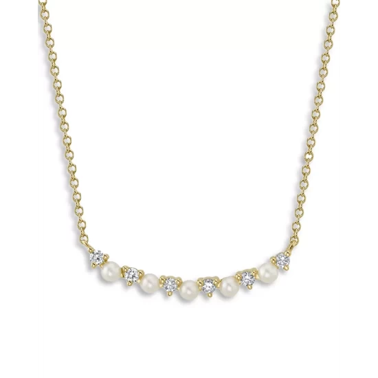 - Exquisite elegance with cultured pearls and diamonds in a curved bar necklace