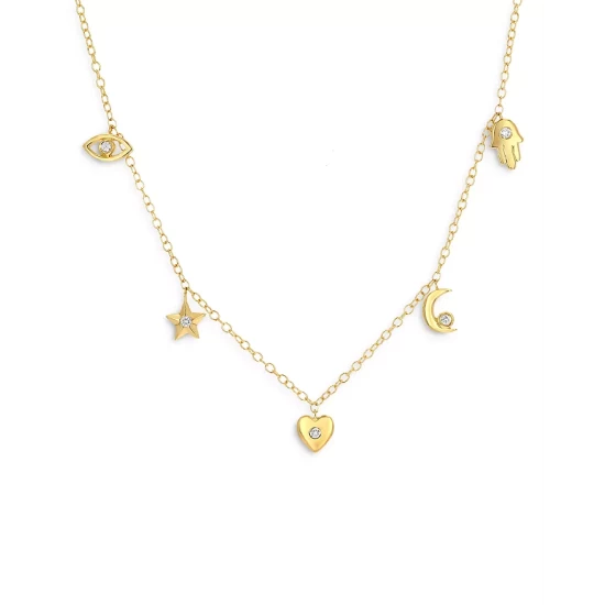 - Five diamond studded charms dangle from this lovely 14k gold necklace