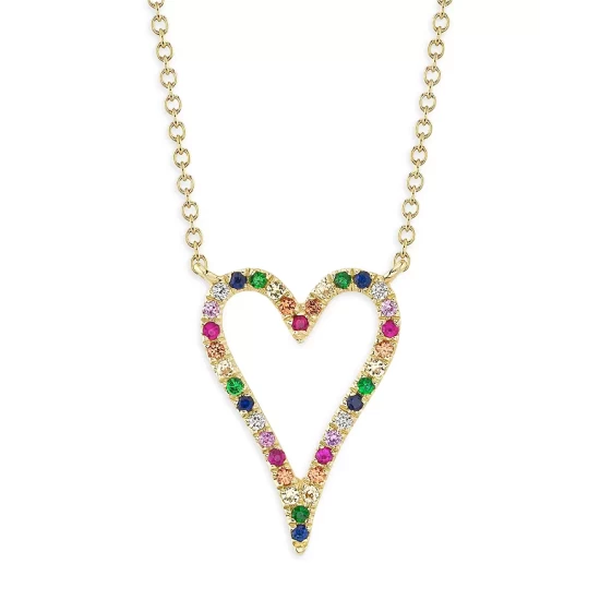 - A colorful multi-gemstone heart pendant necklace in 14K yellow gold