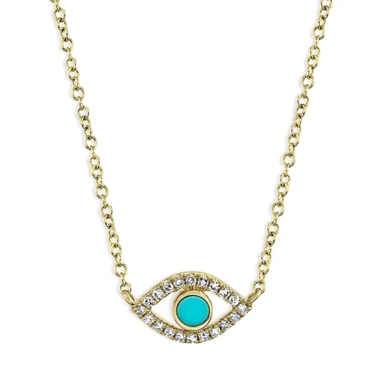- Evil eye pendant outlined in sparkling diamonds with turquoise center hangs on a simple chain
