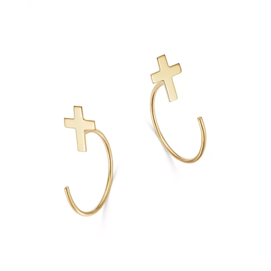 - Delicate gold front-to-back hoops accented with a cross charm at the post