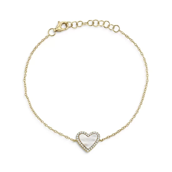 - Classic gold chain bracelet decorated with a mother-of-pearl heart station outlined in diamonds
