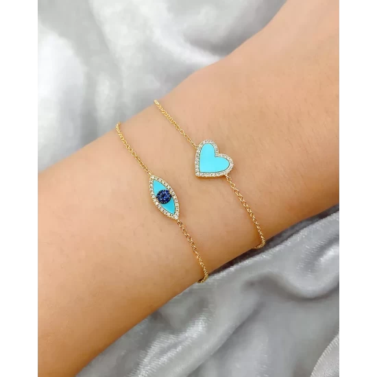 - Classic gold chain bracelet decorated with a turquoise heart station outlined in diamonds