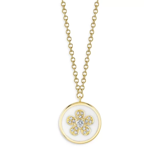- White enamel round pendant decked in a diamond floral design on a simple chain