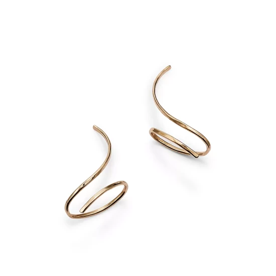- Polished gold climber earrings weave around the ear in a cuff silhouette